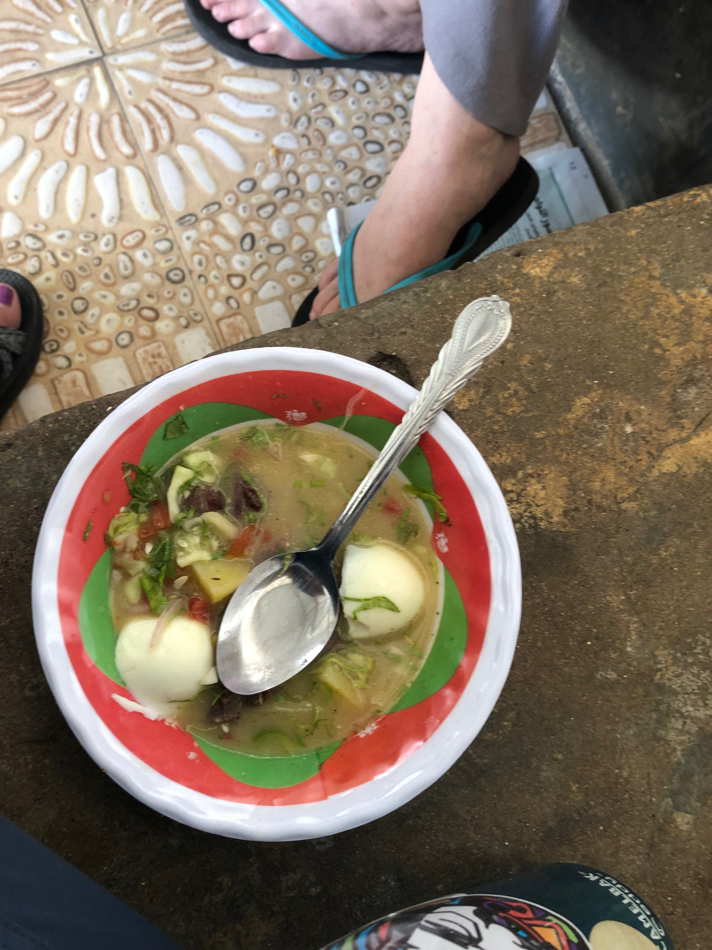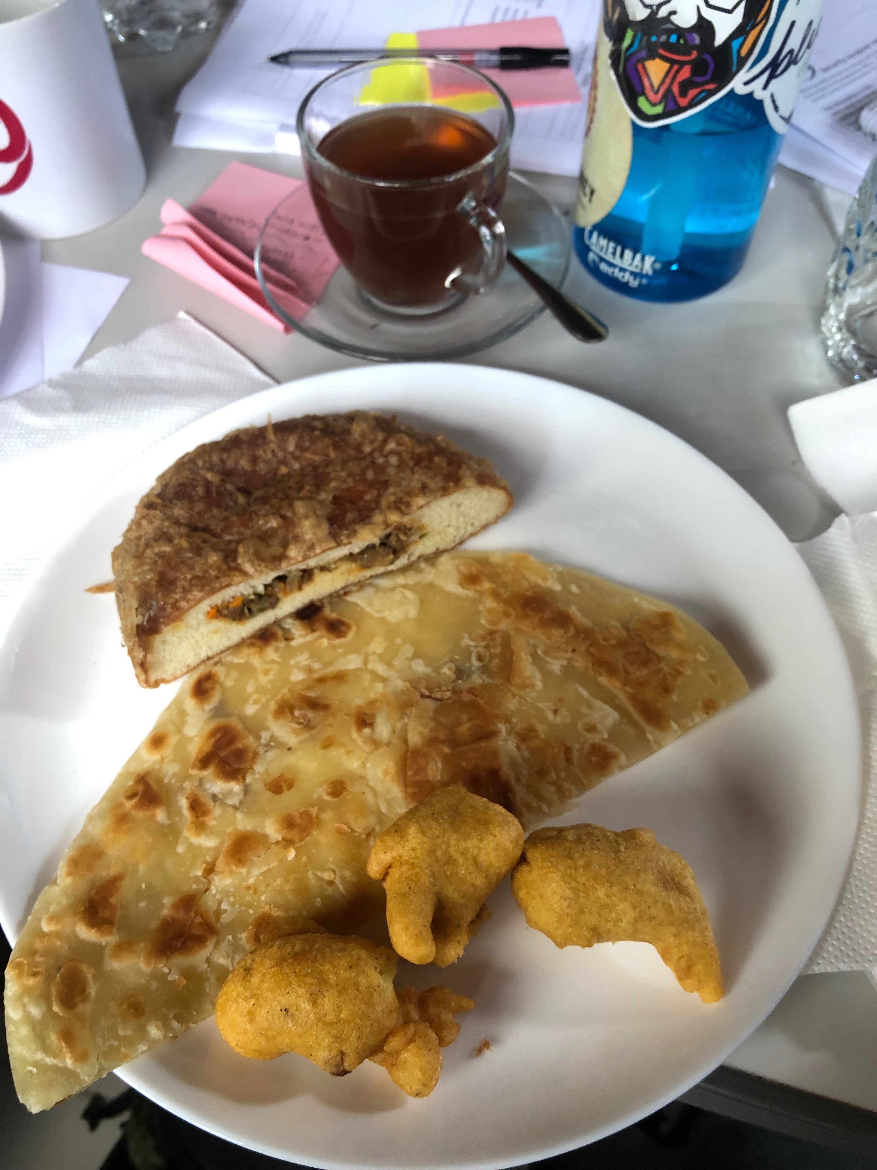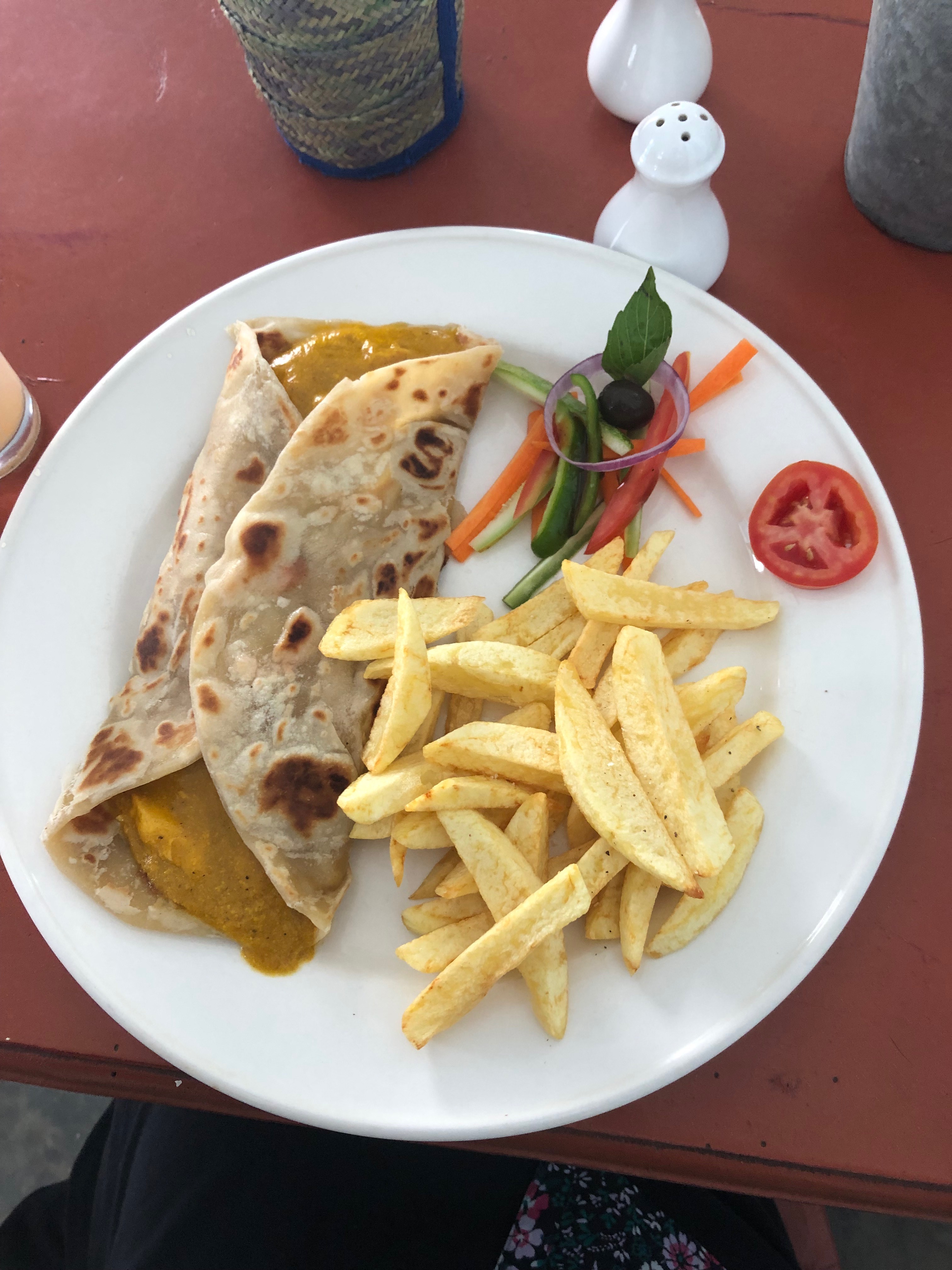 Ethiopian spread, those items that looks like sponges are thin doughy type items you dip in the different sauces and meatsTypical tea break with Tanzanian snacks – chapati, samosas, and some other unknown delicious (re: fried) object. I get to eat every 2-3 hours which is fantastic because that’s what I do at home, albeit a littler healthier but I’m certainly not complaining!Coconut curry chicken wrap w/ fries <wrap was amazing, fries- not so much>Honestly, I don’t know what this is except it’s soup and it was good. Chicken Biryani This is a Tuk Tuk, and how I get to and fro when I don’t have a lot to carry. This was one of my lighter trips to the market. Also, my feet are forever dirty – that’s just the life I live now.